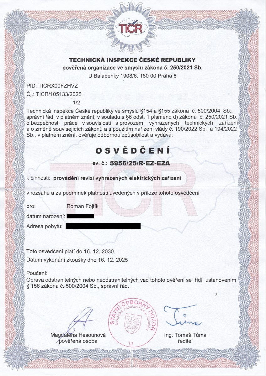 - Technická inspekce České republiky - osvědčení k provádění revizí vyhrazených elektrických zařízení